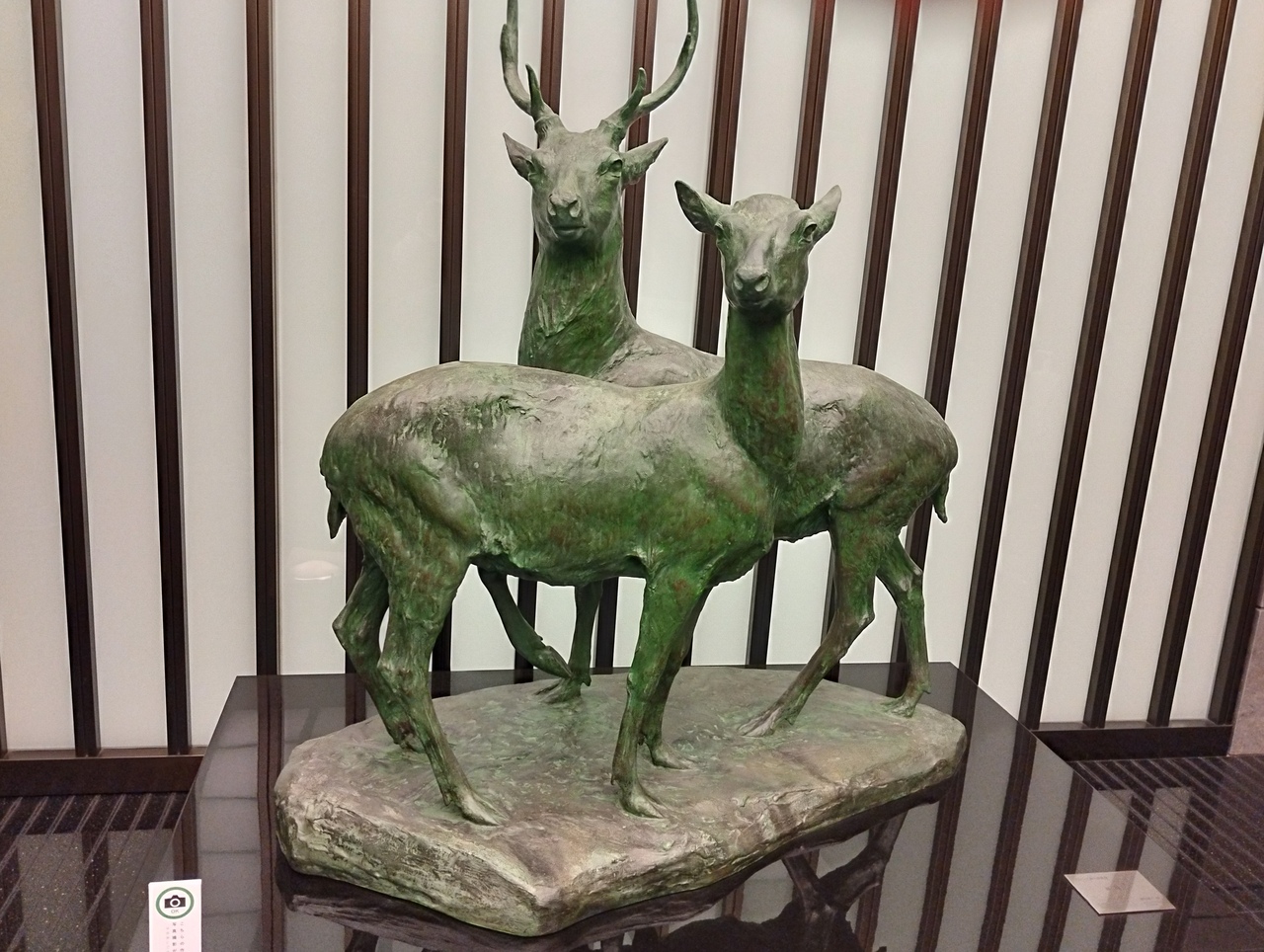 ここのところ外出プログラムは上野公園内の博物館、美術館が続きましたが、10月30日は三越前駅近くの三井記念美術館に行ってきました。久しぶりの電車での外出プログラム、スタッフが遠足気分です(笑)三越前駅下車、豪華な「日本橋三井タワー」に入り、左方向に進んだ所に三井記念美術館行きのエレベーターがあります。7階が美術館で、降りるとすぐの所で鹿像が出迎えてくれます。この像は池田勇八さんという動物彫刻家の作品との事。