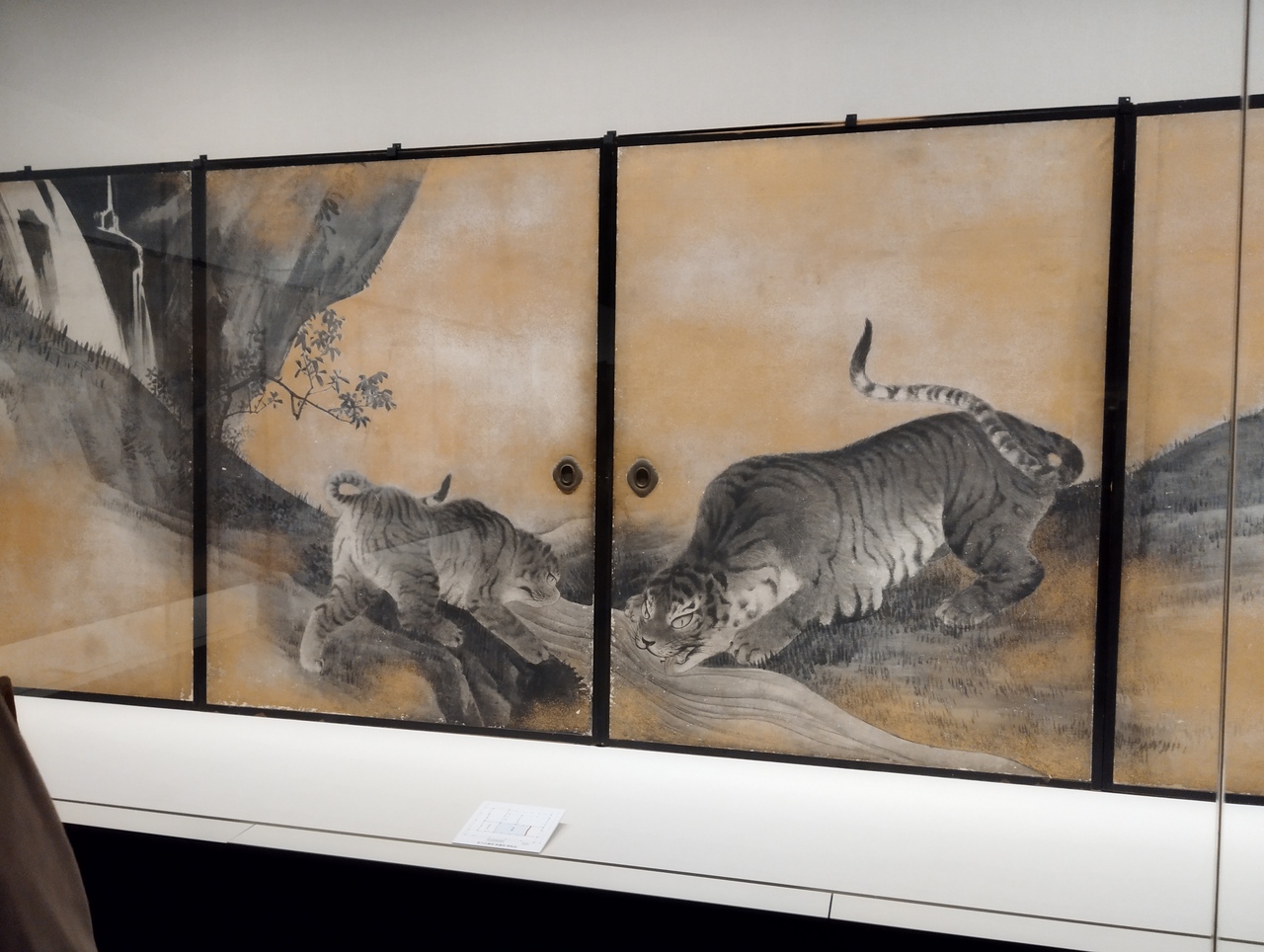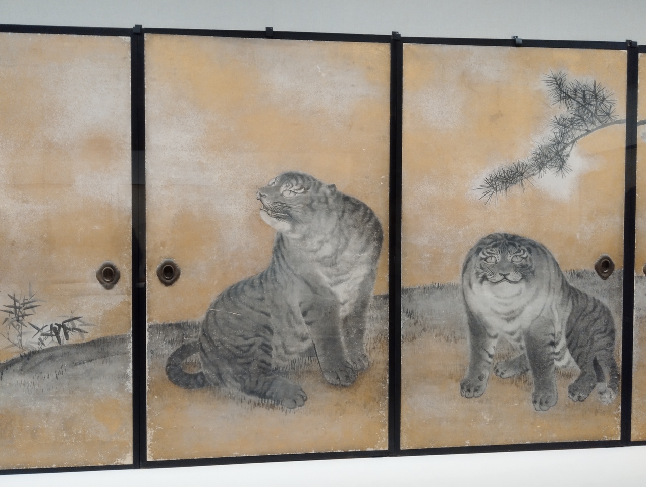 植物図鑑のような植物の絵は、葉っぱが風で落ちていくような動きがあります。可愛らしい子犬、ウサギ、イタチ等々は、動物たちを見つめる応挙の温かい気持ちまで表現されているようです。藤の花の屏風は芳香が漂ってくるかのようでした。また、当時、日本にはいなかった虎ですが、虎皮の敷物を見て虎が遊ぶ様子を描いたとの屏風絵は、実際の虎とは違い、フワフワで可愛らしいです。